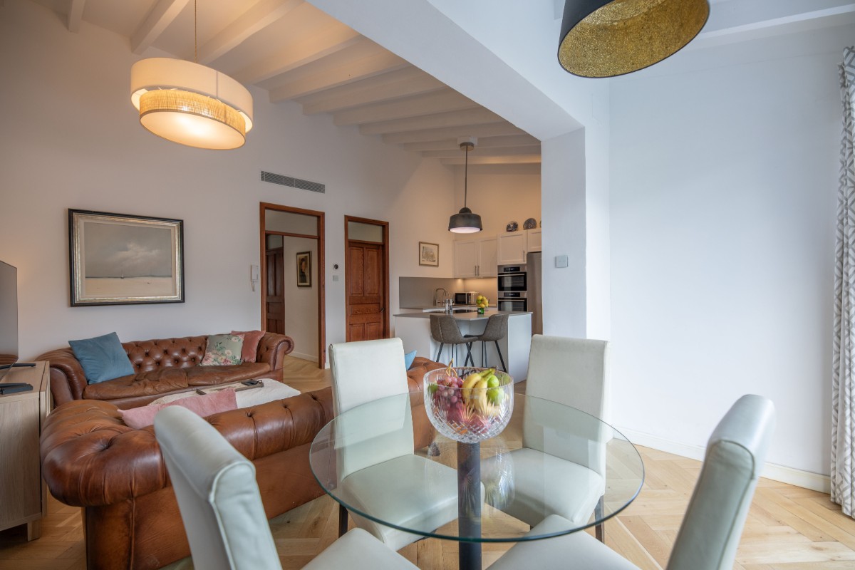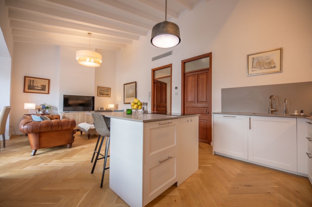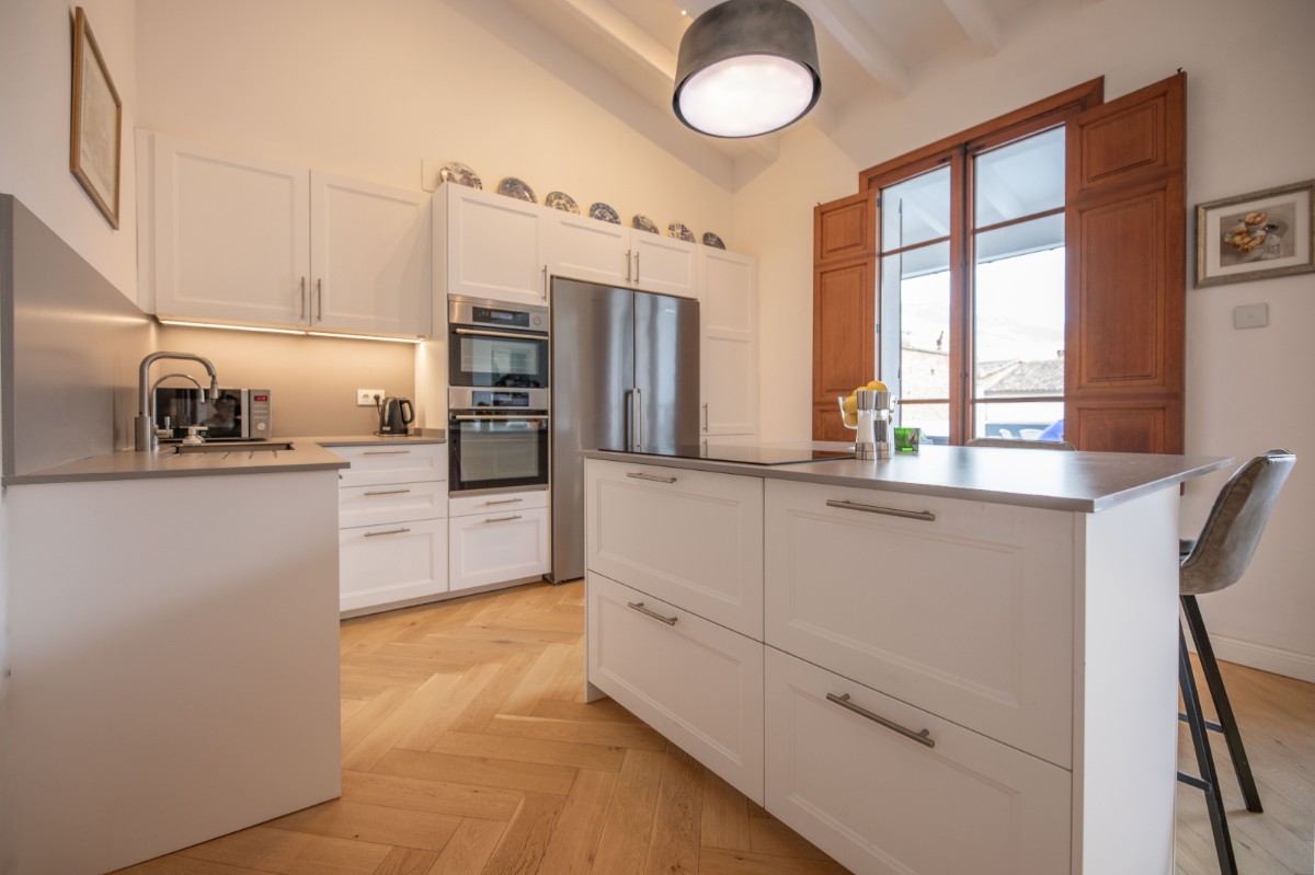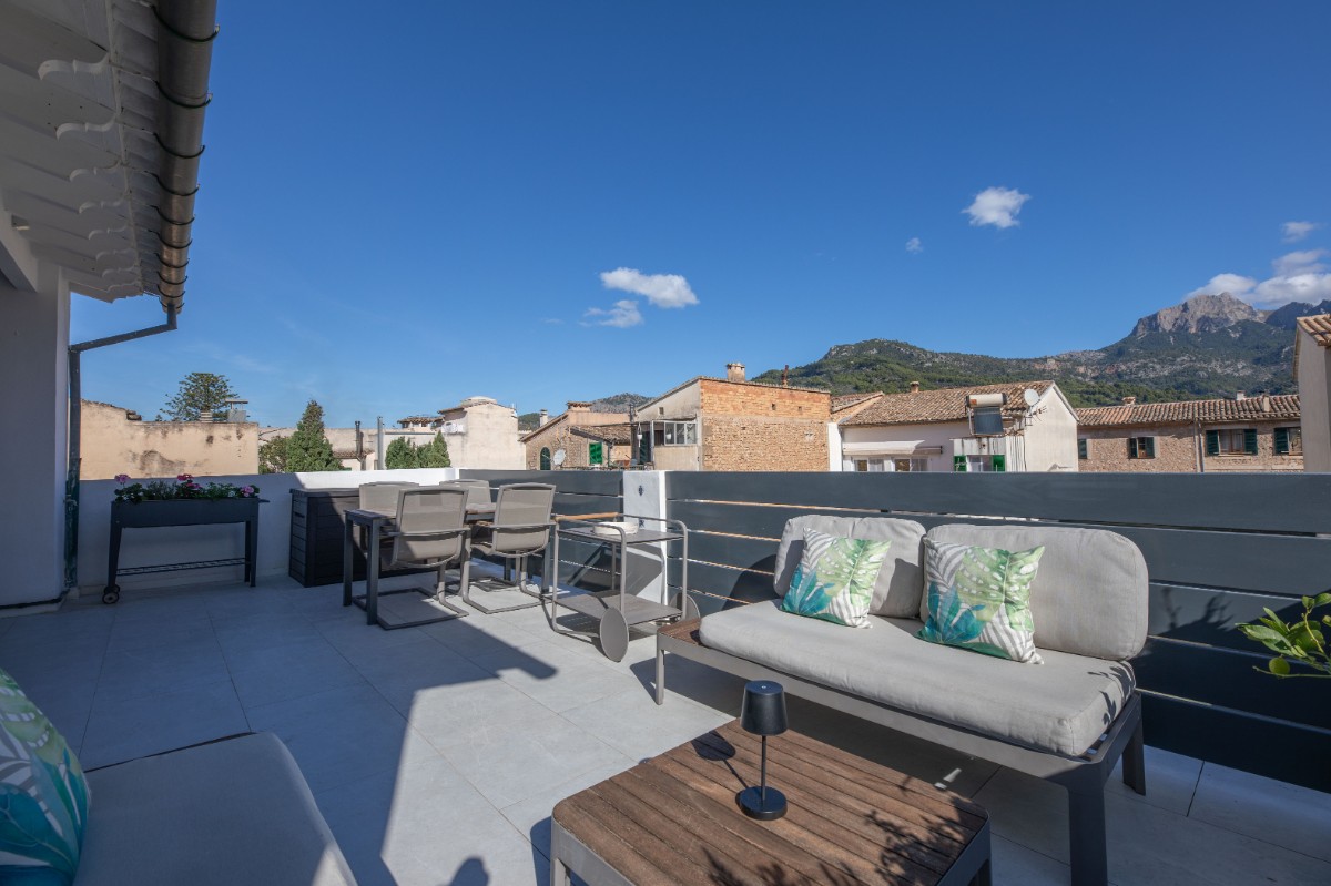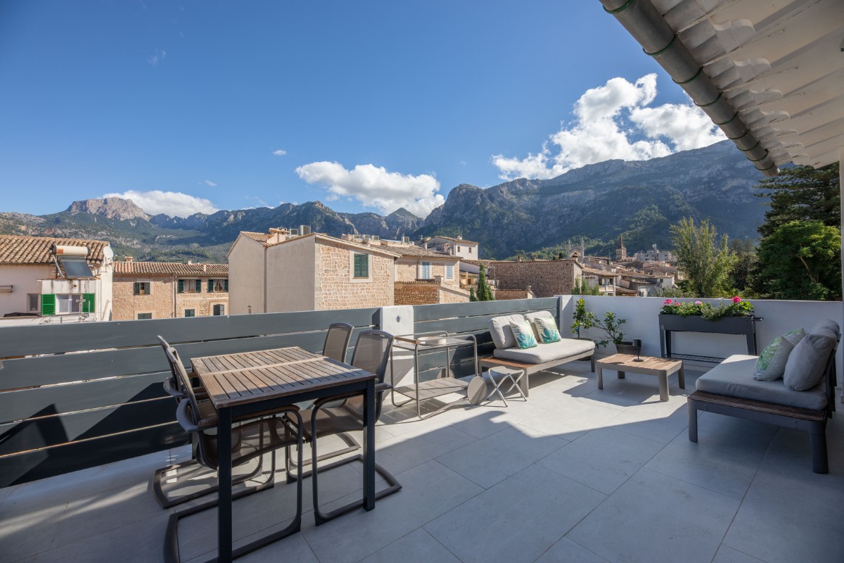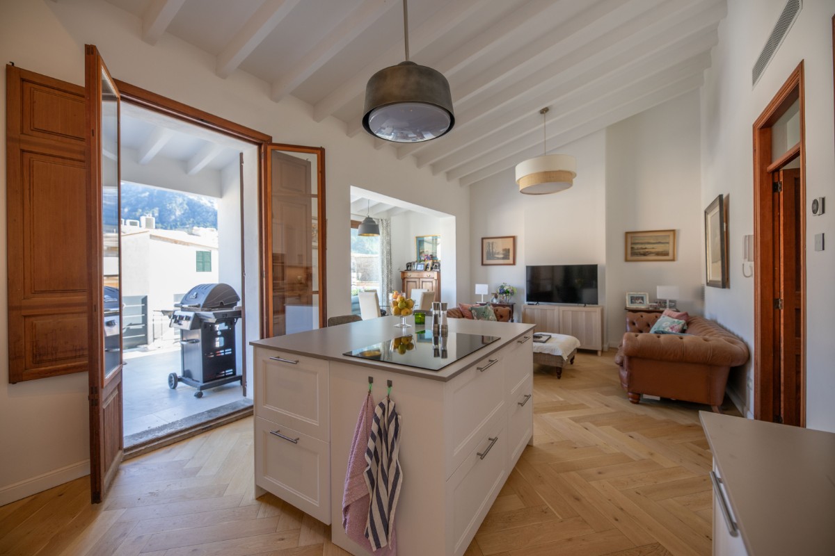 Este apartamento absolutamente encantador y difícil de encontrar en el corazón de Sóller es una verdadera joya. Situado en la emblemática calle Gran Vía, en la parte antigua del centro de Sóller, este apartamento completamente renovado ofrece una experiencia de vida única. Ubicado en la segunda planta de una casa mallorquina con solo otro apartamento, se puede disfrutar de tranquilas vistas al Puig Major y a la iglesia modernista de Sóller. Rodeado de casas señoriales históricas y una avenida arbolada, el entorno es pintoresco y sereno. A pocos metros, los residentes pueden caminar fácilmente hasta la animada Plaza de Sóller, repleta de cafés, restaurantes y tiendas. Este apartamento de 115 metros cuadrados consta de tres amplios dormitorios, uno de los cuales se utiliza actualmente como oficina o gimnasio. El dormitorio principal cuenta con baño en suite. Además, hay un segundo baño con ducha y un aseo de invitados. El espacioso salón se integra perfectamente con la cocina de planta abierta, que incluye un cuarto de lavandería independiente y un altillo para almacenamiento. Grandes puertas correderas conducen a una preciosa terraza de 24 metros cuadrados, donde se pueden disfrutar de impresionantes vistas del entorno. Cada habitación dispone de un sistema de climatización de calefacción y refrigeración independiente, además de preinstalación para paneles solares. Sumérgete en la esencia de la vida en Sóller en esta residencia excepcional.
